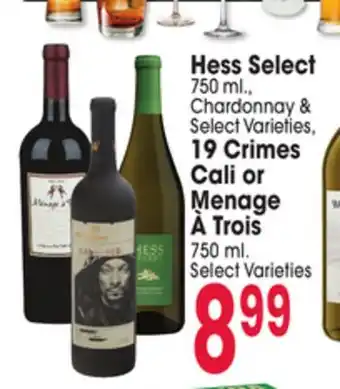 Hess Select 750 ml. Chardonnay & 19 Crimes Cali or Menage A Trois 750 ml