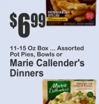 Key Food offers a wide collection of products, besides the 11-15 Oz Box ... Assorted Pot Pies, Bowls or Marie Callender's Dinners. Keep an eye on the weekly Key Food circular to find the best offers and promotions. Besides 11-15 Oz Box ... Assorted Pot Pies, Bowls or Marie Callender's Dinners, you can also find the following offers: MARIE CALLENDER'S POT PIES, Marie Callender's Pot Pies & Marie Callender's Pot Pies.