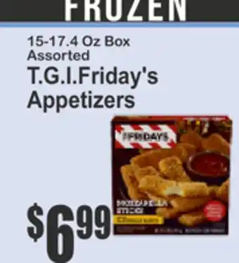 In which store will 15-17.4 Oz Box Assorted T.G.I.Friday's Appetizers be on sale next week? These are some of the questions we get asked a lot. It’s only normal, nobody likes to pay too much! Our team keeps an eye on all deals and lists them online as soon as possible. So you can customize your (shopping) list with this week's offers and those of next week. Make sure to check next week’s Key Food ad, some of the specials are only available next week or online.Frequently asked questions about 15-17.4 Oz Box Assorted T.G.I.Friday's Appetizers