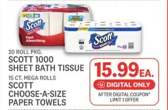 SCOTT 1000 SHEET BATH TISSUE, 20 ROLL PKG., SCOTT CHOOSE-A-SIZE PAPER TOWELS 15 CT. MEGA ROLLS deal in the weekly ad of Kings Food Markets