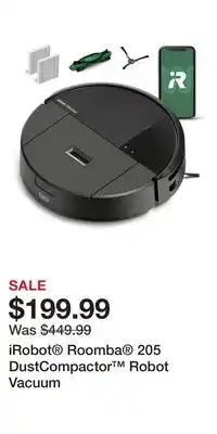 The iRobot Roomba 205 DustCompactor Robot Vacuum is available this week in the weekly ad of Kohl's, with an attractive discount. On this page, you’ll find all the information about current promotional prices, terms of the promotion, and special discounts. Browse through the weekly ad and check out other offers and promotions related to iRobot Roomba 205 DustCompactor Robot Vacuum to ensure you get the best deal.The deal for iRobot Roomba 205 DustCompactor Robot Vacuum is valid in week 06 and can be found in the current weekly ad. Has the deal expired? No worries, you can always check other interesting offers in the weekly ad. You can also follow the product category to be immediately informed when iRobot Roomba 205 DustCompactor Robot Vacuum is back in the weekly ad of Kohl's.