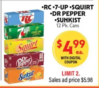 This offer is available in various stores, view all products to get the cheapest •RC •7-UP •SQUIRT •DR PEPPER •SUNKIST. If you'd like to find out whether this product has a bigger discount in another store, check the category 'Grocery'. You may also find these offers interesting: •7-UP •SQUIRT •DR PEPPER, 7UP, Squirt, RC Cola or Dr Pepper, 12 Pk, 12 oz Cans 7UP, Squirt or Dr Pepper, 8 Pk, 12 oz & Dr Pepper , 7UP , Canada Dry , A&W , RC Cola or Sunkist.