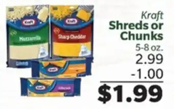 In which store will Kraft Shreds or Chunks be on sale next week? These are some of the questions we get asked a lot. It’s only normal, nobody likes to pay too much! Our team keeps an eye on all deals and lists them online as soon as possible. So you can customize your (shopping) list with this week's offers and those of next week. Make sure to check next week’s Living Fresh Market ad, some of the specials are only available next week or online.Frequently asked questions about Kraft Shreds or Chunks