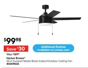 The price of 52-in Sunport Matte Black Indoor/Outdoor Ceiling Fan can be found at the top of the page, together with the dates during which the offer is available. You can also check the price in the current Lowe's weekly ad or on the Lowe's website. Promotional offers assure you of buying Lowe's products at the lowest price.
