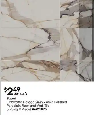 The Calacatta Dorado 24-in x 48-in Polished Porcelain Floor and Wall Tile is available this week in the weekly ad of Lowe's, with an attractive discount. On this page, you’ll find all the information about current promotional prices, terms of the promotion, and special discounts. Browse through the weekly ad and check out other offers and promotions related to Calacatta Dorado 24-in x 48-in Polished Porcelain Floor and Wall Tile to ensure you get the best deal.The deal for Calacatta Dorado 24-in x 48-in Polished Porcelain Floor and Wall Tile is valid in week 05 and can be found in the current weekly ad. Has the deal expired? No worries, you can always check other interesting offers in the weekly ad. You can also follow the product category to be immediately informed when Calacatta Dorado 24-in x 48-in Polished Porcelain Floor and Wall Tile is back in the weekly ad of Lowe's.