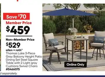 The price of Thomas Lake 3-Piece Gray Balcony Height Patio Dining Set can be found at the top of the page, together with the dates during which the offer is available. You can also check the price in the current Lowe's weekly ad or on the Lowe's website. Promotional offers assure you of buying Lowe's products at the lowest price.