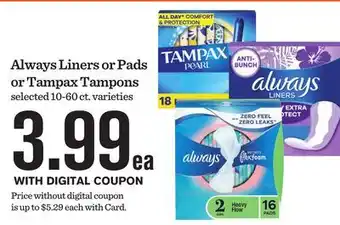 Always Liners or Pads or Tampax Tampons Discount at Mariano's