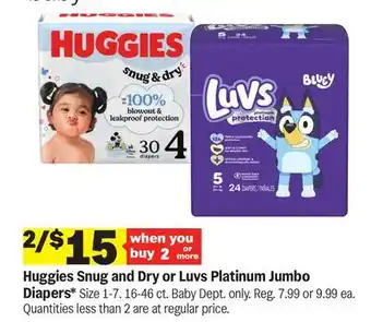Huggies Snug and Dry or Luvs Platinum Jumbo Diapers deal in the weekly ad of Meijer