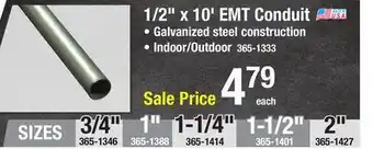 The price of 1/2 x 10' EMT Conduit can be found at the top of the page, together with the dates during which the offer is available. You can also check the price in the current Menards weekly ad or on the Menards website. Promotional offers assure you of buying Menards products at the lowest price.