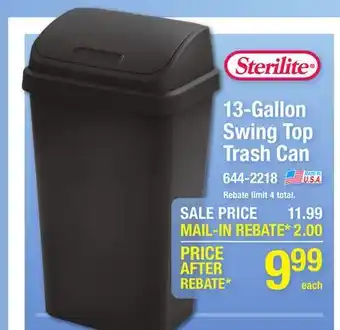 The price of 13-Gallon Swing Top Trash Can can be found at the top of the page, together with the dates during which the offer is available. You can also check the price in the current Menards weekly ad or on the Menards website. Promotional offers assure you of buying Menards products at the lowest price.