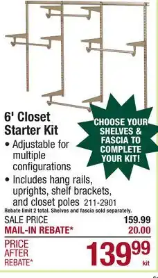 This offer is available in various stores, view all products to get the cheapest 6' Closet Starter Kit. If you'd like to find out whether this product has a bigger discount in another store, check the category 'DIY'. You may also find these offers interesting: Wire Closet Kit, Cirkul Starter Kit & Swiffer PowerMop Starter Kit.