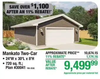 The price of Mankato Two-Car can be found at the top of the page, together with the dates during which the offer is available. You can also check the price in the current Menards weekly ad or on the Menards website. Promotional offers assure you of buying Menards products at the lowest price.
