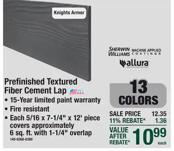 The price of Prefinished Textured Fiber Cement Lap can be found at the top of the page, together with the dates during which the offer is available. You can also check the price in the current Menards weekly ad or on the Menards website. Promotional offers assure you of buying Menards products at the lowest price.