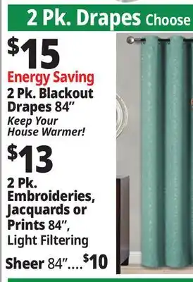 This offer is available in various stores, view all products to get the cheapest 2 pk. Drapes. If you'd like to find out whether this product has a bigger discount in another store, check the category 'Department Stores'. You may also find these offers interesting: 4-pk. Dough, 4-6 Pk. Placemats & 10 Pk. Fabric Napkins.