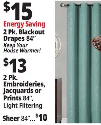 This offer is available in various stores, view all products to get the cheapest 2 Pk. Drapes. If you'd like to find out whether this product has a bigger discount in another store, check the category 'Department Stores'. You may also find these offers interesting: Drapes, Gatorade 12 pk., 12 oz.or Propel 12 pk., 16.9 oz & 8 Pk. Flashlights.