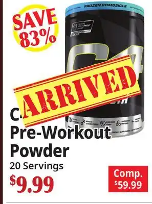 This offer is available in various stores, view all products to get the cheapest C4 Pre-Workout Powder. If you'd like to find out whether this product has a bigger discount in another store, check the category 'Department Stores'. You may also find these offers interesting: C-4 Sport Pre-Workout, Six Star Pre-Workout & C4 Whey Protein Powder.