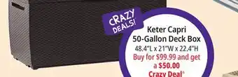 This Keter Capri 50-Gallon Deck Box Brown is now on deal at Ocean State Job Lot. All information about current prices, promotional conditions, and durations can be found on this page. Also check out other comparable deals and promotions related to Keter Capri 50-Gallon Deck Box Brown, so you can always make the most cost-effective choice.The duration of the Keter Capri 50-Gallon Deck Box Brown deal is from 05-03-2026 to 26-05-2026. If the deal is no longer valid, you can look at other comparable offers. You can also follow the product category to stay informed as soon as Keter Capri 50-Gallon Deck Box Brown is on deal again at Ocean State Job Lot. By comparing Keter Capri 50-Gallon Deck Box Brown deals, you'll know whether it's wise to wait on a purchase because it might have been cheaper or might come up cheaper in a future deal. So keep an eye on our site to see if Keter Capri 50-Gallon Deck Box Brown appears next week with a significant discount in the flyer.