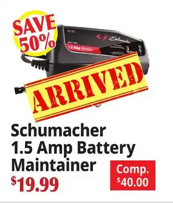 This offer is available in various stores, view all products to get the cheapest Schumacher 1.5 Amp Battery Maintainer. If you'd like to find out whether this product has a bigger discount in another store, check the category 'Department Stores'. You may also find these offers interesting: Schumacher Battery Charger & Maintainer, 100-Amp & 200-Amp.