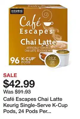 Office Depot offers a wide collection of products, besides the Café Escapes Chai Latte Keurig Single-Serve K-Cup Pods, 24 Pods Per Pack, Case Of 4 Packs. Keep an eye on the weekly weekly ad to find the best offers and promotions. Besides Café Escapes Chai Latte Keurig Single-Serve K-Cup Pods, 24 Pods Per Pack, Case Of 4 Packs, you can also find the following offers: Keurig single-serve coffee pods, Mott's Single-Serve K-Cup Pods, Hot Apple Cider, Pack Of 24 & Bigelow Single-Serve K-Cup Pods, Earl Grey Tea, Box Of 24.