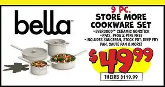 This offer is available in various stores, view all products to get the cheapest 9 PC. bella STORE MORE COOKWARE SET. If you'd like to find out whether this product has a bigger discount in another store, check the category 'Wholesale'. You may also find these offers interesting: 10 Pc. Gift Set, Schmidt Brothers 7 PC Gridiron A Set & 11 Pc. Reciprocating Saw Set.