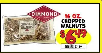 This offer is available in various stores, view all products to get the cheapest CHOPPED WALNUTS. If you'd like to find out whether this product has a bigger discount in another store, check the category 'Wholesale'. You may also find these offers interesting: Diamond Chopped Walnuts, Diamond Baking Chopped Walnuts & Diamond Baking Nuts Chopped Pecans 8 oz. pkg. Walnuts 16 oz. pkg., shelled or 14 oz. pkg. chopped.
