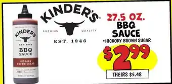 In which store will KINDER'S BBQ SAUCE HICKORY BROWN SUGAR be on sale next week? These are some of the questions we get asked a lot. It’s only normal, nobody likes to pay too much! Our team keeps an eye on all deals and lists them online as soon as possible. So you can customize your (shopping) list with this week's offers and those of next week. Make sure to check next week’s Ollie's ad, some of the specials are only available next week or online.Frequently asked questions about KINDER'S BBQ SAUCE HICKORY BROWN SUGAR