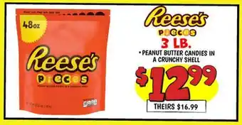 This offer is available in various stores, view all products to get the cheapest Reese's pieces 3 LB. If you'd like to find out whether this product has a bigger discount in another store, check the category 'Wholesale'. You may also find these offers interesting: REESE'S PIECES, 3 Lb. Peanut Pieces & Reese's Pieces Peanut Butter Eggs.