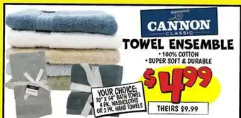 Ollie's offers a wide collection of products, besides the TOWEL ENSEMBLE. Keep an eye on the weekly Ollie's weekly ad to find the best offers and promotions. Besides TOWEL ENSEMBLE, you can also find the following offers: CANNON CLASSIC TOWEL ENSEMBLE, Character Hooded Towel, 2-pack & Bath Towel and Bath Buddy Set.