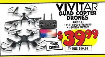 The VIVITAR QUAD COPTER DRONES is available this week in the weekly ad of Ollie's, with an attractive discount. On this page, you’ll find all the information about current promotional prices, terms of the promotion, and special discounts. Browse through the weekly ad and check out other offers and promotions related to VIVITAR QUAD COPTER DRONES to ensure you get the best deal.The deal for VIVITAR QUAD COPTER DRONES is valid in week 50 and can be found in the current weekly ad. Has the deal expired? No worries, you can always check other interesting offers in the weekly ad. You can also follow the product category to be immediately informed when VIVITAR QUAD COPTER DRONES is back in the weekly ad of Ollie's.
