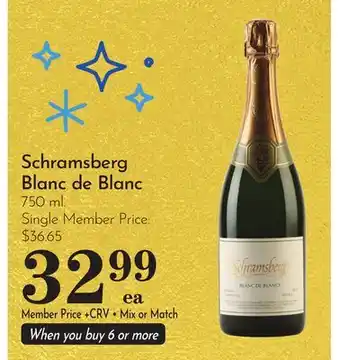 The price of Schramsberg Blanc de Blanc can be found at the top of the page, together with the dates during which the offer is available. You can also check the price in the current Pavilions weekly ad or on the Pavilions website. Promotional offers assure you of buying Pavilions products at the lowest price.