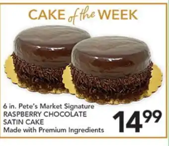 The price of 6 in. Pete's Market Signature RASPBERRY CHOCOLATE SATIN CAKE can be found at the top of the page, together with the dates during which the offer is available. You can also check the price in the current weekly ad or on the Pete's Fresh Market website. Promotional offers assure you of buying Pete's Fresh Market products at the lowest price.
