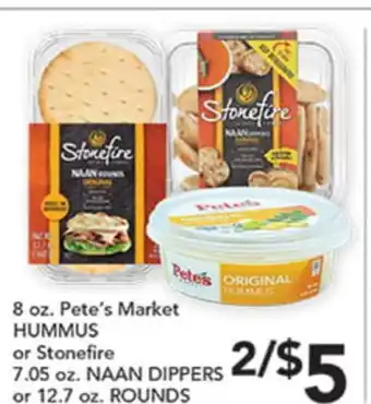 Current 8 oz. Pete's Market HUMMUS or Stonefire 7.05 oz. NAAN DIPPERS or 12.7 oz. ROUNDS deal at Pete's Fresh Market from 4-03 until 10-03.