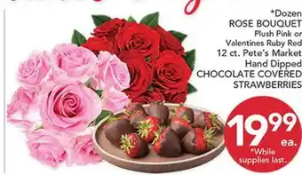 The price of ROSE BOUQUETS, Plush Pink or Valentines Ruby Red, 12 ct can be found at the top of the page, together with the dates during which the offer is available. You can also check the price in the current weekly ad or on the Pete's Fresh Market website. Promotional offers assure you of buying Pete's Fresh Market products at the lowest price.