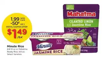 This offer is available in various stores, view all products to get the cheapest Minute Rice. If you'd like to find out whether this product has a bigger discount in another store, check the category 'Grocery'. You may also find these offers interesting: Minute Rice or Mahatma Ready Rice, Minute Rice or Mahatma Ready Rice & Minute Rice Stop & Shop Instant White Rice.