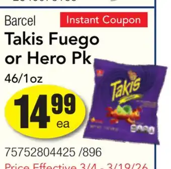 Current Barcel Takis Fuego or Hero Pk deal at Restaurant Depot from 1-03 until 31-03.