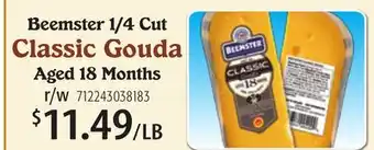 This offer is available in various stores, view all products to get the cheapest Beemster 1/4 Cut Classic Gouda. If you'd like to find out whether this product has a bigger discount in another store, check the category 'Restaurants'. You may also find these offers interesting: Shredded Gouda Cheese, MARIEKE GOUDA CHEESE WEDGES OR SPREADS & Gonnella Baguette Classic.