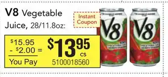 This offer is available in various stores, view all products to get the cheapest V8 Vegetable Juice. If you'd like to find out whether this product has a bigger discount in another store, check the category 'Restaurants'. You may also find these offers interesting: V8 V-Fusion +Energy or Vegetable Juice, V8 Fusion or Vegetable Juice Blend & Suja Vegetable Juice.