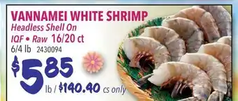 This offer is available in various stores, view all products to get the cheapest VANNAMEI WHITE SHRIMP. If you'd like to find out whether this product has a bigger discount in another store, check the category 'Restaurants'. You may also find these offers interesting: Raw Shrimp VANNAMEI WHITE, 26-30Ct. White Shrimp Headless & X-LARGE WHITE SHRIMP.