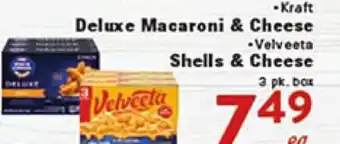 This offer is available in various stores, view all products to get the cheapest •Kraft Deluxe Macaroni & Cheese •Velveeta Shells & Cheese. If you'd like to find out whether this product has a bigger discount in another store, check the category 'Grocery'. You may also find these offers interesting: 3 pk. Kraft Deluxe MACARONI & CHEESE or Velveeta SHELLS & CHEESE, Kraft Deluxe or Velveeta Macaroni & Cheese & Kraft Macaroni & Cheese or Velveeta Shells & Cheese.