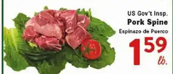 This offer is available in various stores, view all products to get the cheapest US Gov't Insp. Pork Spine. If you'd like to find out whether this product has a bigger discount in another store, check the category 'Grocery'. You may also find these offers interesting: US Gov't Insp. Pork Rib Tips, US Gov't Insp. Whole Boneless Pork Loin Roast & US. Gov't Insp. WHOLE CHICKEN PINWHEELS.