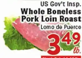 This offer is available in various stores, view all products to get the cheapest US Gov't Insp. Whole Boneless Pork Loin Roast. If you'd like to find out whether this product has a bigger discount in another store, check the category 'Grocery'. You may also find these offers interesting: US Gov't Insp. Pork Spine, US. Gov't Insp. WHOLE CHICKEN PINWHEELS & US Gov't Insp. Pork Rib Tips.