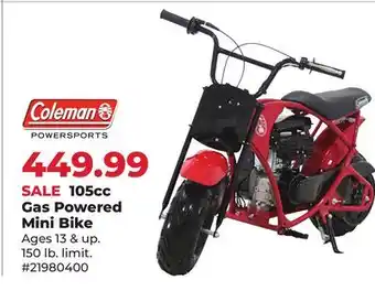The price of Coleman POWERSPORTS 105cc Gas Powered Mini Bike can be found at the top of the page, together with the dates during which the offer is available. You can also check the price in the current weekly ad or on the Runnings website. Promotional offers assure you of buying Runnings products at the lowest price.