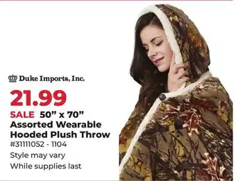 Duke Imports 50 x 70 Assorted Wearable Hooded Plush Throw deals and online offers from the current Runnings weekly ad
