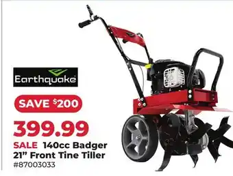 This offer is available in various stores, view all products to get the cheapest Earthquake 140cc Badger 21 Front Tine Tiller. If you'd like to find out whether this product has a bigger discount in another store, check the category 'Grocery'. You may also find these offers interesting: 40 Tine De-Thatcher, Steel Tine or Poly Tine Leaf Rake & Ace Steel Tine or Poly Tine Leaf Rake.