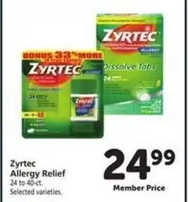 This offer is available in various stores, view all products to get the cheapest Zyrtec Allergy Relief. If you'd like to find out whether this product has a bigger discount in another store, check the category 'Grocery'. You may also find these offers interesting: Zyrtec Allergy Relief, Zyrtec Allergy Relief, 90 ct & Zyrtec 24 Hour Allergy Relief Tablets.