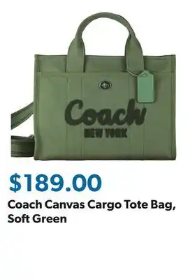 Sam's Club offers a wide collection of products, besides the Coach Canvas Cargo Tote Bag, Soft Green. Keep an eye on the weekly weekly ad to find the best offers and promotions. Besides Coach Canvas Cargo Tote Bag, Soft Green, you can also find the following offers: Canvas Large Cameryn Tote Bag, Men's Flex Cargo Canvas Pants & Printed Tote Bag.
