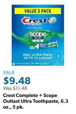 Sam's Club offers a wide collection of products, besides the Crest Complete + Scope Outlast Ultra Toothpaste, 6.3 oz., 5 pk. Keep an eye on the weekly Sam's Club weekly ad to find the best offers and promotions. Besides Crest Complete + Scope Outlast Ultra Toothpaste, 6.3 oz., 5 pk, you can also find the following offers: Crest 3D White Toothpaste or Scope Outlast Mouthwash, Crest 3D White Toothpaste 3.3 oz. or Scope Outlast Mouthwash* 1 liter & Crest 3D White Toothpaste 3.3 oz. or Scope Outlast Mouthwash* 1 liter.