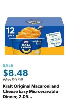 The price of Kraft Original Macaroni and Cheese Easy Microwavable Dinner, 2.05 oz., 12 pk can be found at the top of the page, together with the dates during which the offer is available. You can also check the price in the current Sam's Club weekly ad or on the Sam's Club website. Promotional offers assure you of buying Sam's Club products at the lowest price.