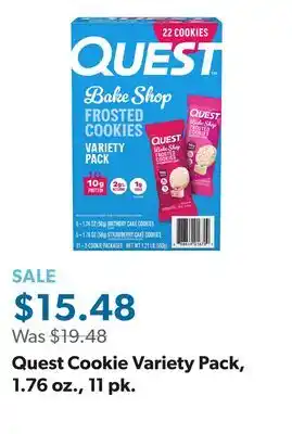 Sam's Club offers a wide collection of products, besides the Quest Cookie Variety Pack, 1.76 oz., 11 pk. Keep an eye on the weekly Sam's Club weekly ad to find the best offers and promotions. Besides Quest Cookie Variety Pack, 1.76 oz., 11 pk, you can also find the following offers: Quest Soft & Chewy 15g Protein Cookie, Variety Pack, 12 ct, RXBAR Protein Bar, Variety Pack, 1.83 oz., 14 pk & Jack Link's Beef Jerky, Variety Pack, 1.25 oz., 9 pk.