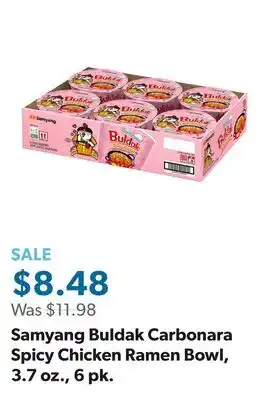 The price of Samyang Buldak Carbonara Spicy Chicken Ramen Bowl, 3.7 oz., 6 pk can be found at the top of the page, together with the dates during which the offer is available. You can also check the price in the current Sam's Club weekly ad or on the Sam's Club website. Promotional offers assure you of buying Sam's Club products at the lowest price.